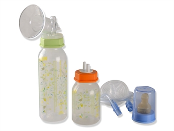 Includes two plastic bottles (125 cc and 250 cc) nipple shield, filter and tubes.