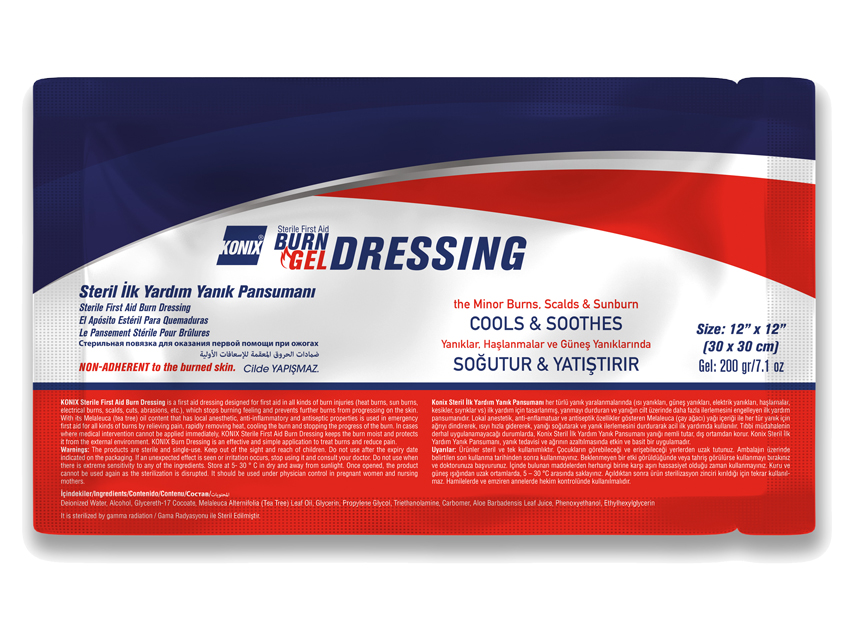 Konix® Sterile Burn Dressing is designed for first aid in all kinds of burn injuries (heat burns, sun burns, electrical burns, scalds, cuts, abrasions, etc.).